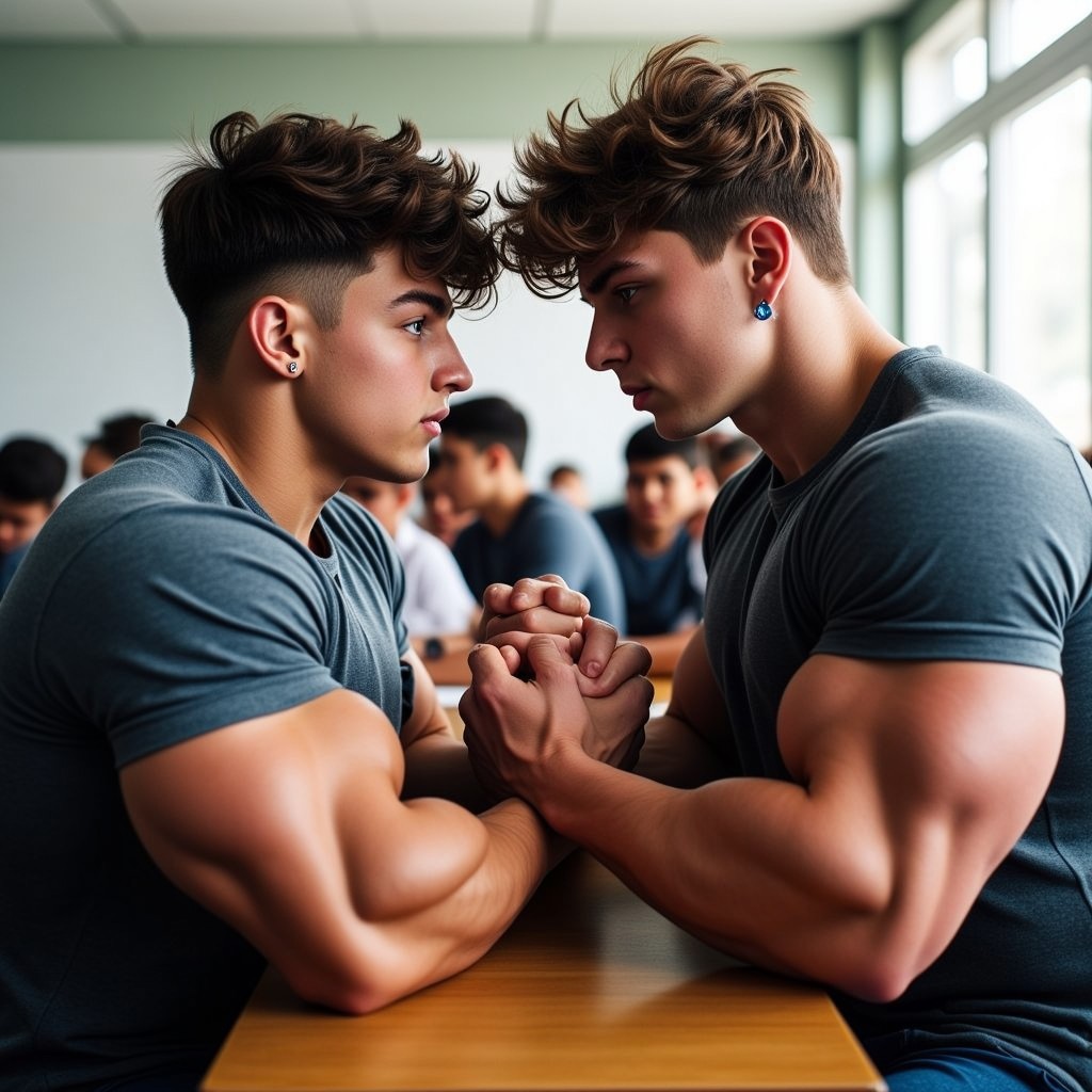2 beautiful 18yo bodybuilder males in a tight fitting cap sleeved t-shirts with a plunging neckline showing most of their huge pecs and deep cleavage, full body shot, messed up style hair, cover model, skin details, inside school classroom with students in the background sitting at a desk arm wrestling, ,biceps bulging, ultrarealistic, hyperdetailed photography, soft light, model look, looking at each other, long hair, earrings, blue eyes, bulging muscles, vascular,