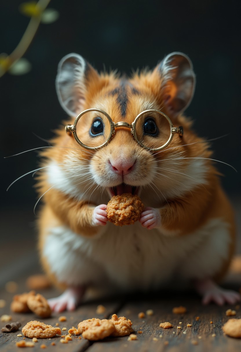 an intellectual and philosophical hamster with glasses and a scar on his forehead like Harry Potter reflects on life... and how he can stuff even more food into his mouth, causing his cheeks to puff out, a calm and soothing atmosphere. a magic wand lies on the floor with cookie crumbs