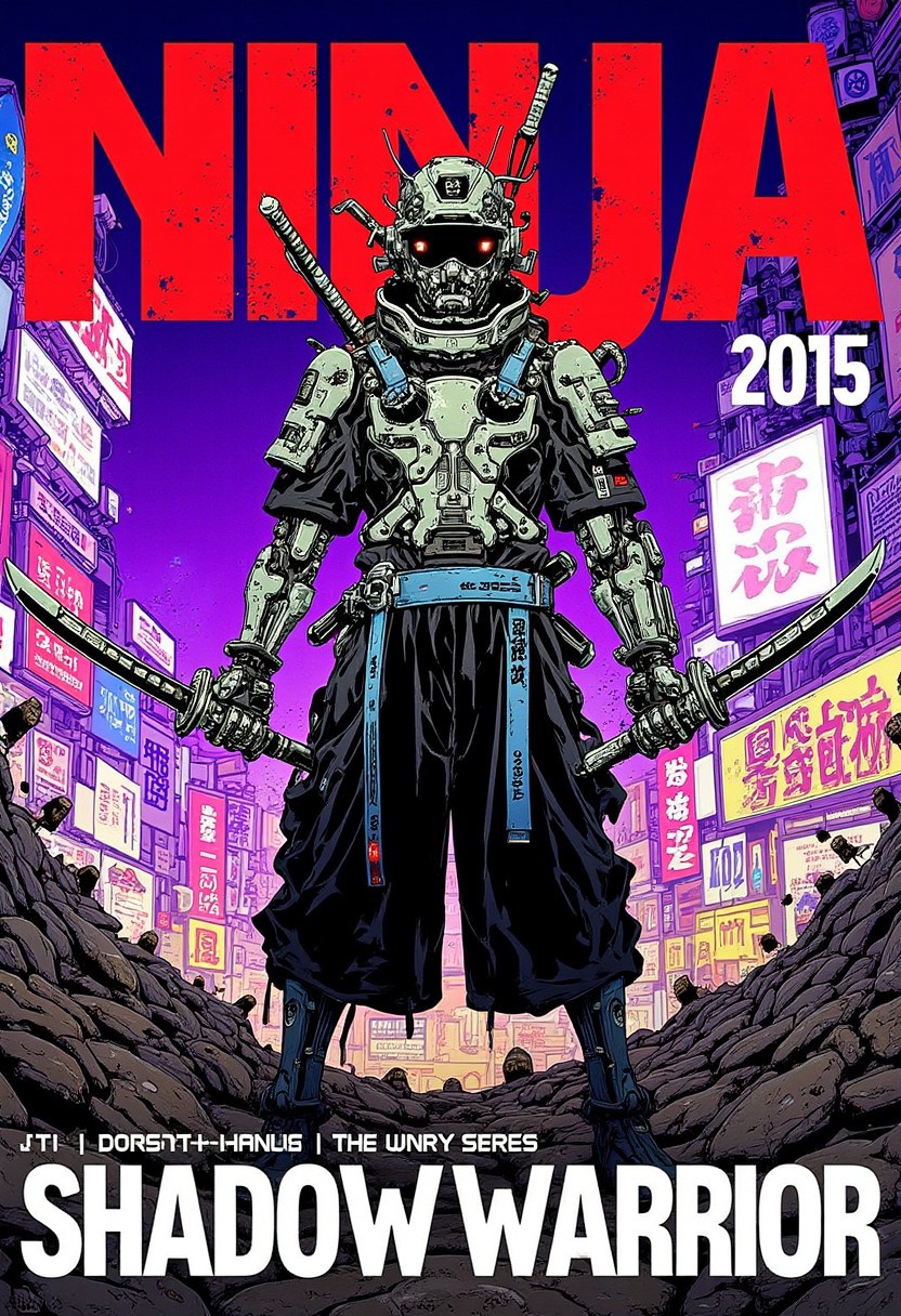 An anime poster image featuring a Japanese-style cyborg ninja, with the title 'NINJA' written in bold red letters, and a smaller white subtitle reading 'SHADOW WARRIOR'. The cyborg ninja is holding katanas in both hands and striking a dynamic pose against a vibrant cyberpunk city backdrop. The image is in 'cybermono_style', with a vivid and intense atmosphere.