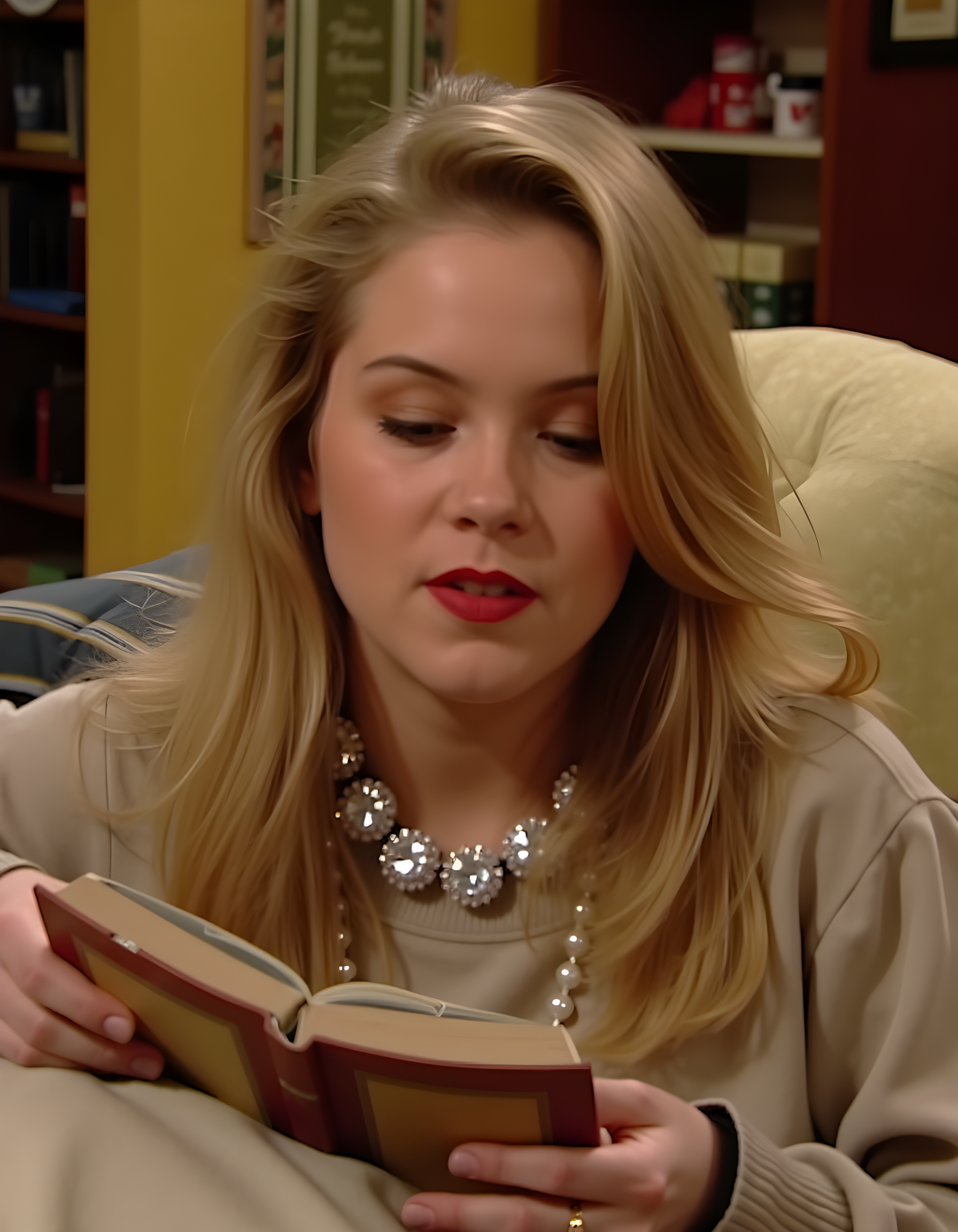 In a dimly lit, cluttered 1990s-style bedroom, the camera captures a close-up of Kelly Bundy from That '70s Show, her striking blonde hair cascading down to her shoulders in loose, glossy waves. Her gaze is closed, lost in thought, as she leans back on her elbow against the headboard, her lips slightly parted and a single strand of hair falling across her forehead. The room's warm, yellow glow illuminates her face, casting shadows that accentuate the delicate lines of her features. A dazzling, large pearl necklace drapes around her neck, catching the light and reflecting its brilliance onto her fair skin, as she clutches a tattered copy of her favorite book in one hand, evoking a sense of peaceful contemplation and nostalgia.