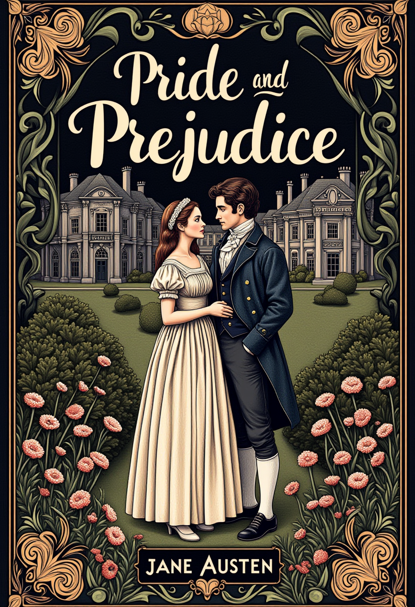 dark cover with brush lettering text "Pride and Prejudice", smaller text "Jane Austen", novuschroma illustration design patterns, Elizabeth Bennet and Mr Darcy from the book Pride and Prejudice, wearing fashion from early 19th century, with a large estate from the 1800s in the background