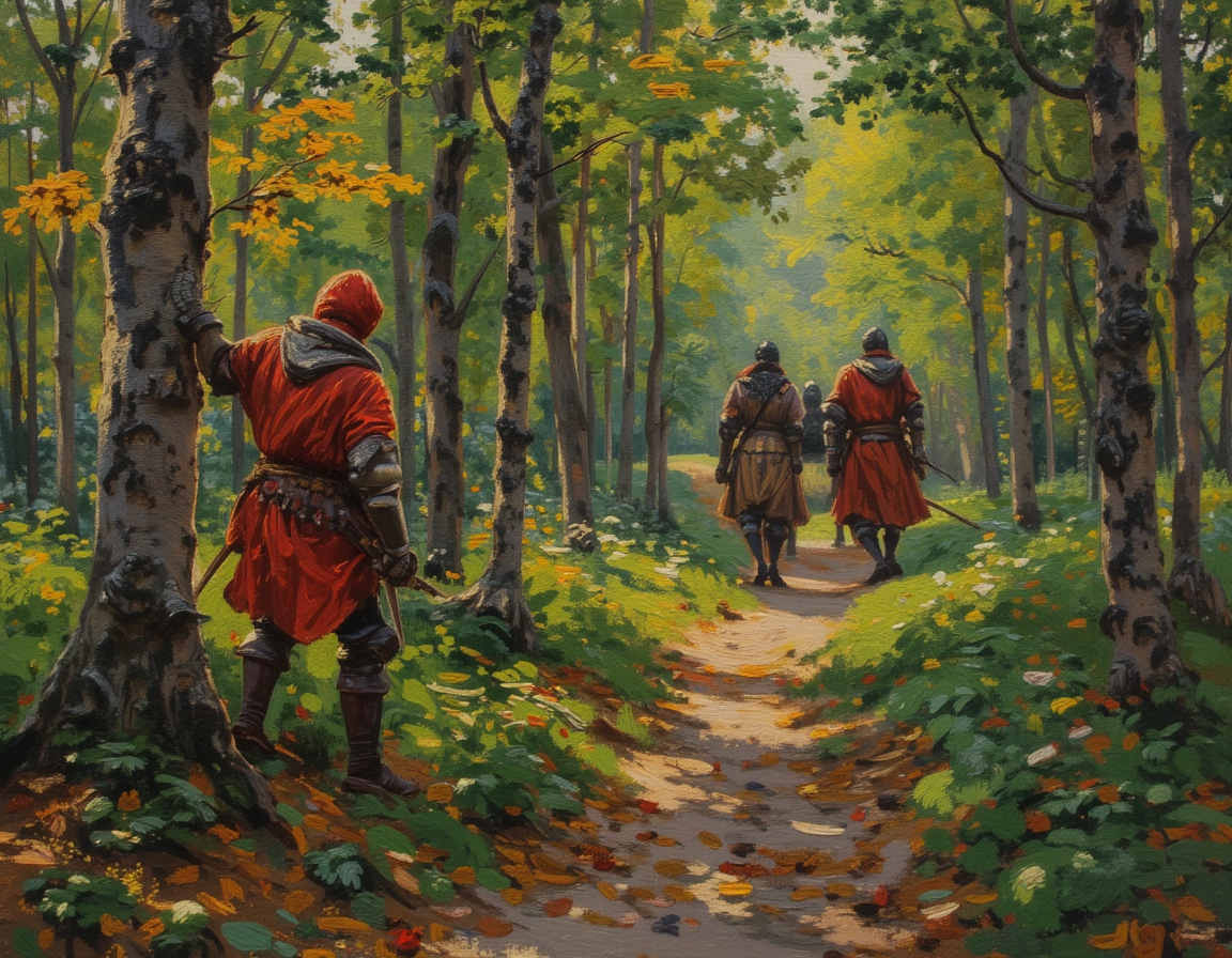 <lora:lora:1> OByouhua, oil painting of a medieval robin hood hiding behind a tree, on the path 2 knights are searching for him, forest, day time