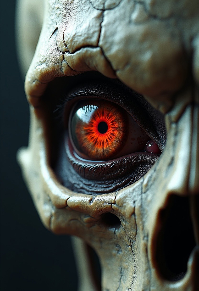 photorealistic extreme close-up of a demons eye, skull, high detail, shallow depth of field, Hyperrealism .