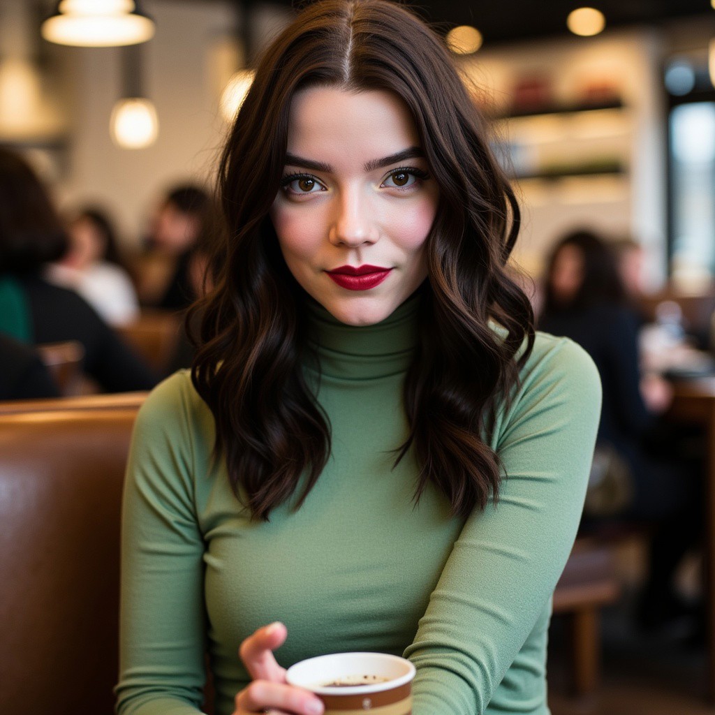 realistic photo of, 1girl, solo, Anyataylorjoyflux1a has fair complexion She has long, dark brown hair styled in loose waves cascading over her right shoulder, with a few strands framing her face red lipstick wearing a fitted light green turtleneck sweater, sitting in a cafe holding a coffee, . She is looking at the viewer, smiling Fujifilm XT3, F/8, photo-realistic face