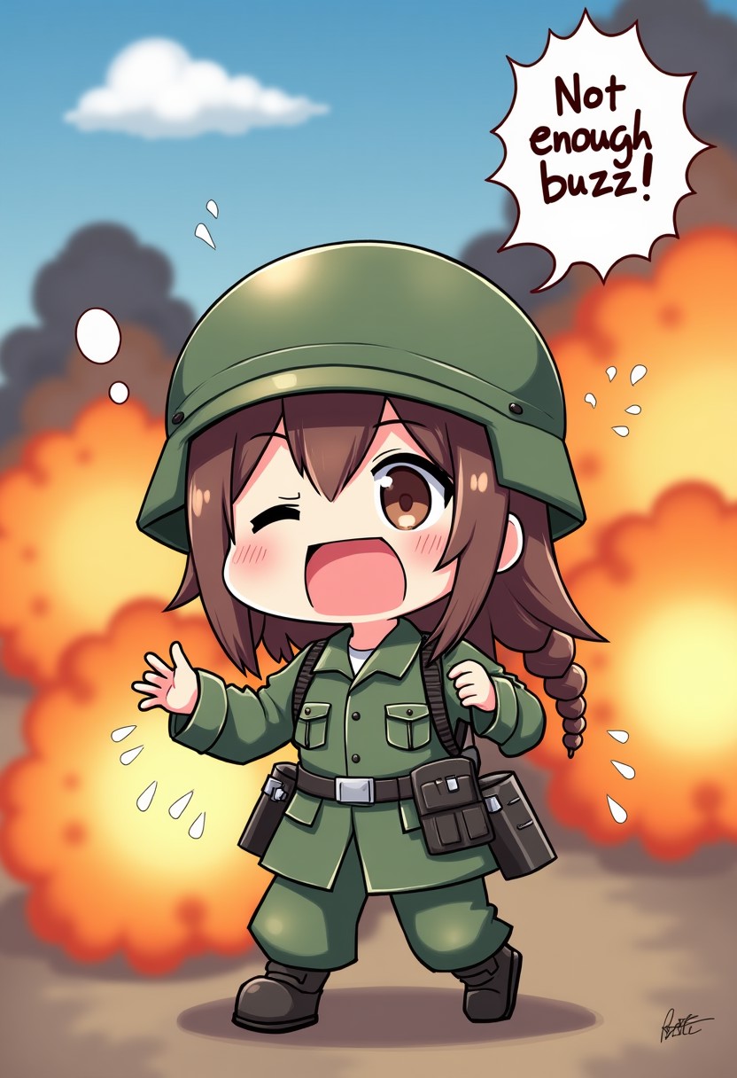 masterpiece, kawaii anime style, high quality, explosions on the background, war, cute soldier girl yells, chibi, speech bubble with text "Not enough buzz!"