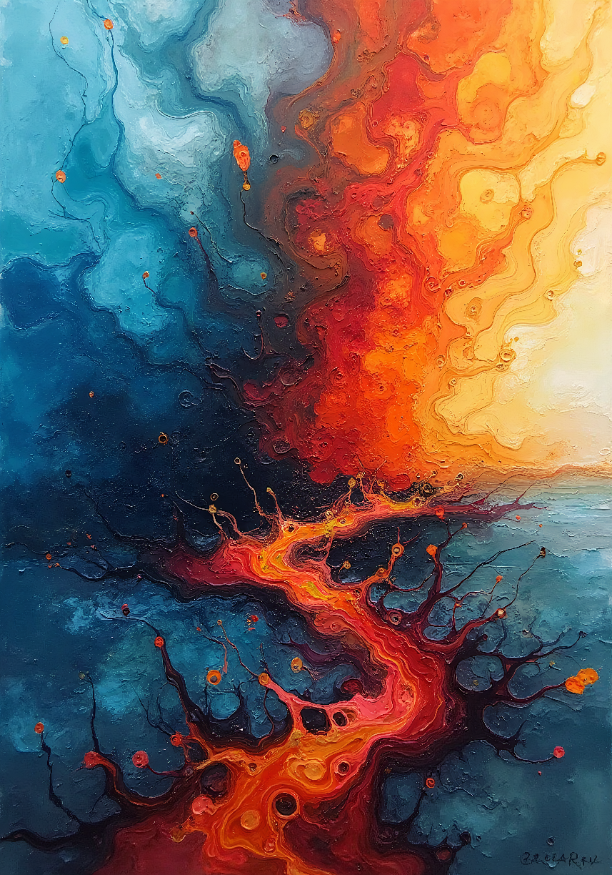 Alcohol ink art inspired by "The Fukushima Disaster":1.2, featuring a canvas covered in soft, textured cloth that enhances the depth of the piece. The artwork bursts with fluid and vibrant colors, swirling blues, fiery reds, and luminous yellows, creating an intense contrast that evokes the chaotic energy of the disaster. Unpredictable patterns intertwine seamlessly, mimicking organic textures reminiscent of nature's resilience after a catastrophe. Translucent layers of color overlap, allowing viewers to see glimpses of underlying hues, resulting in abstract compositions that suggest both destruction and rebirth. Ethereal and dreamy effects are achieved through free-flowing movement, as expressive brushstrokes capture the emotional gravity of the subject. The contemporary aesthetic is complemented by the choice of wet textured paper, which adds an element of unpredictability, further enhancing the abstract nature of the piece while inviting contemplation on the themes of loss, recovery, and the beauty of chaos.