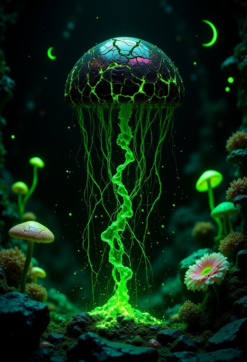 green cracks on black, best quality, reality-shot, realism, realistic portrait photography of a beautiful siren with whimsical elements, awesome appearence, magical fairytale landscape, elaborate fantasy style art, black and light pink theme, intricate details, exquisite detail, ultra sharp, flawless composition, vivid colors, masterpiece, exciting background with glowing flowers and a crescent moon, opalescence, fantastical Crystal, glowing, Waterdrop, jellyfish, Framed by plants, in the style of art nouveau