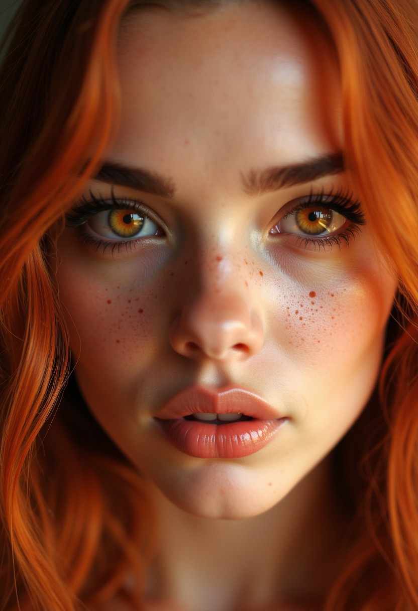 Hyperrealism, extreme close-up Portrait of a beautiful, stunning unique female character. She looks like Adult Emma Watson. She has deep orange eyes filled with flirty feelings and excitement, extravagant eyelashes, making this image a masterpiece of photography and digital art. Style: realistic hyper-detailed rendering, 32k UHD, expressive eyes, long dark orange hair, graphic design, a lot of light brown freckles on her face, pretty and beautiful, sultry lips, gleaming lips, white skin, freckles, telling a tale of adventure. Exuding confidence and