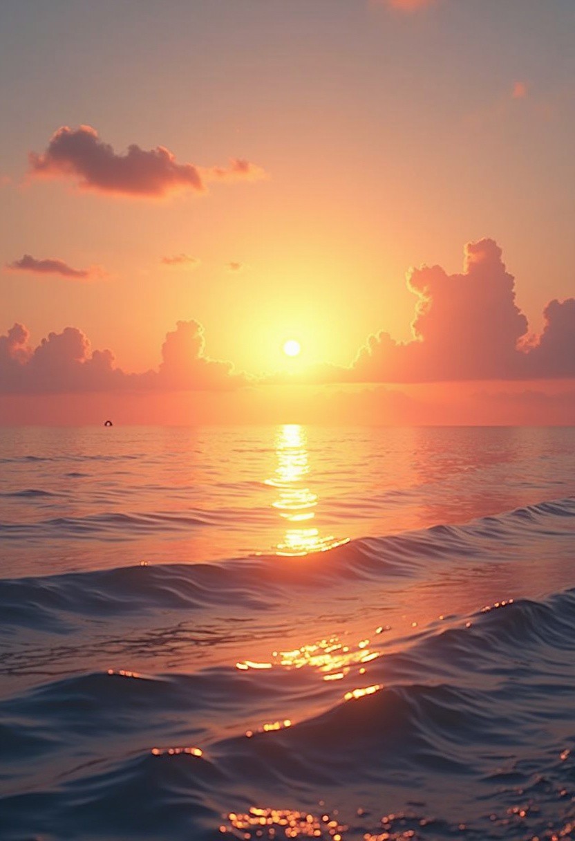 serene seascape during sunset, soft golden light reflecting on gentle waves, vibrant orange to pastel pink sky, delicate clouds, faint silhouettes of island or small boat, peaceful atmosphere, heavenly glow illuminating the horizon, hyperrealistic, cinematic lighting, masterpiece digital painting by Claude Monet and Thomas Kinkade, 8k resolution