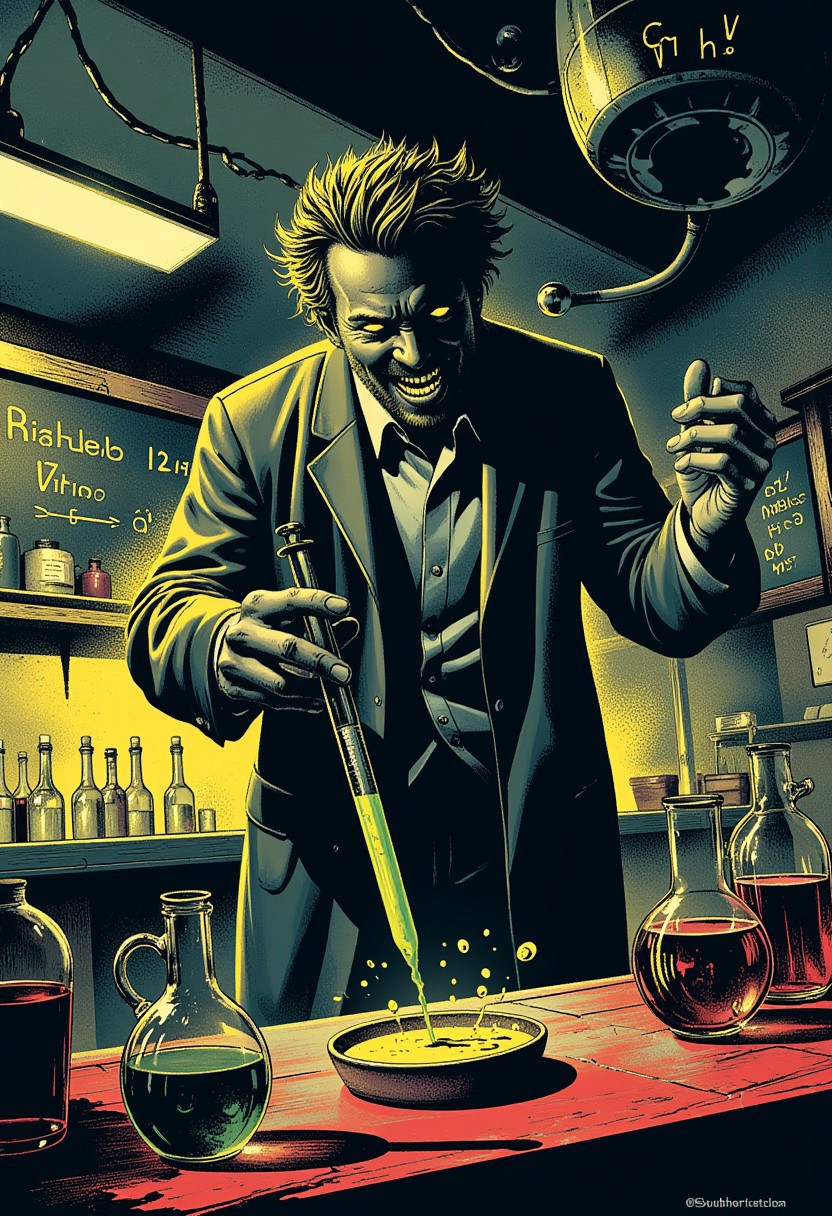 A twisted scientist with wild hair and a manic grin stands in a dimly lit laboratory filled with bubbling vials and strange machinery. The environment is cluttered and chaotic, with dark stains on the walls and flickering fluorescent lights overhead. The atmosphere is unsettling and claustrophobic, filled with a sense of impending doom. Rendered in a graphic novel style, the colors are muted with splashes of sickly yellow and deep crimson, illuminated by harsh overhead lights that create stark contrasts. The perspective is a medium shot, capturing the scientist's frenzied expression as he holds a syringe filled with a glowing green substance, hinting at a horrific experiment. Additional elements include ominous shadows lurking in the corners and a chalkboard filled with disturbing equations. The artwork employs ink and digital techniques to create a gritty, textured look, emphasizing the madness of scientific obsession, Poster art, occult, western esoteric art, aidmaMJ6.1