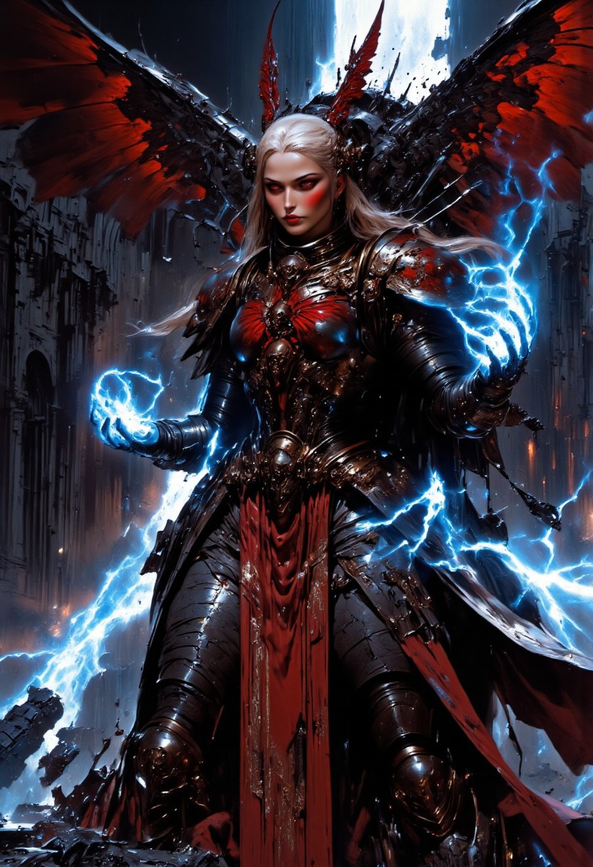 A beautiful woman with red eyes and long silver hair, wearing a NightL40K power armor, casting electric thunder spells from her hands in an attacking pose. The art is in the style of a fantasy style, concept design with a full body shot. masterpiece, best quality, highly detailed, sharp focus, dynamic lighting, mythp0rt