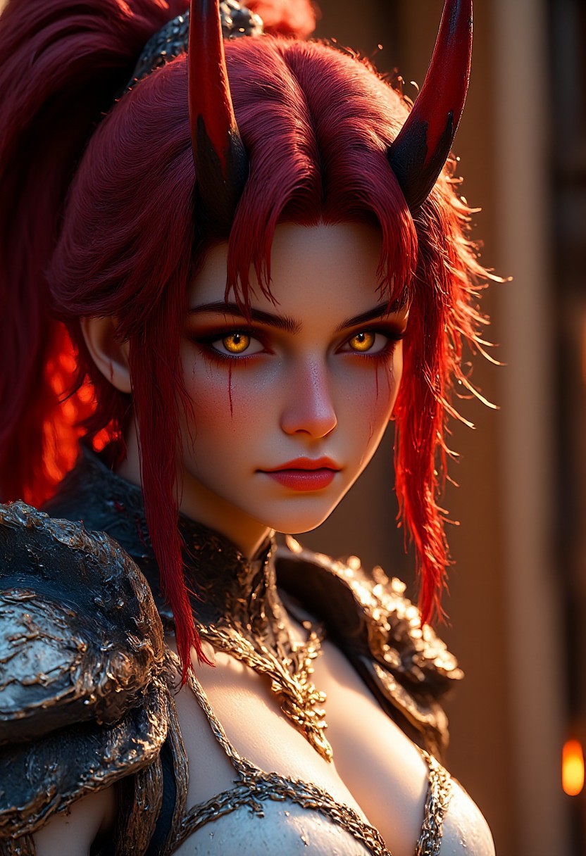 An hyper detailed cinematographic shot of Zeriastra, a loseup from side portrait of Zeriastra, woman (eruopeam caucasian, slightly tanned, adult, tall female, golden eyes, red makeup, red hair, streaked hair, long hair ponytail, ponytail, short hairs, red and black horns, spiky horns, large round breasts, muscular) wearing a white and black armor, hkstyle, the background is a blurred inferno. the focus is toward her face as she have an enraged expression