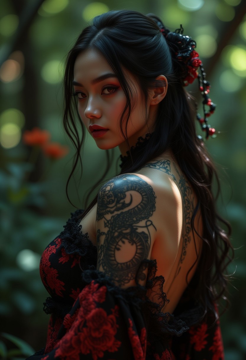 masterpiece, best quality, ultra high resolution, A masterpiece that conveys the captivating charm of a beautiful woman with a devilish figure, adorned with a lace dress in the Baroque style. The photo shows a close-up of a girl with black long hair, her beautiful red eyes are beautiful, in a kimono with an open back. Detailed yakuza dragon tattoo on her back, in a Japanese garden. Cinematic style, (((ultra-realistic style))), realistic soft lighting, dark, eye-catching, atmospheric lighting, natural, shallow depth of field, (highlights: 0.8), high detail (dynamic, sincere, emotional, cinematic shot, film grain, bokeh, depth of field,