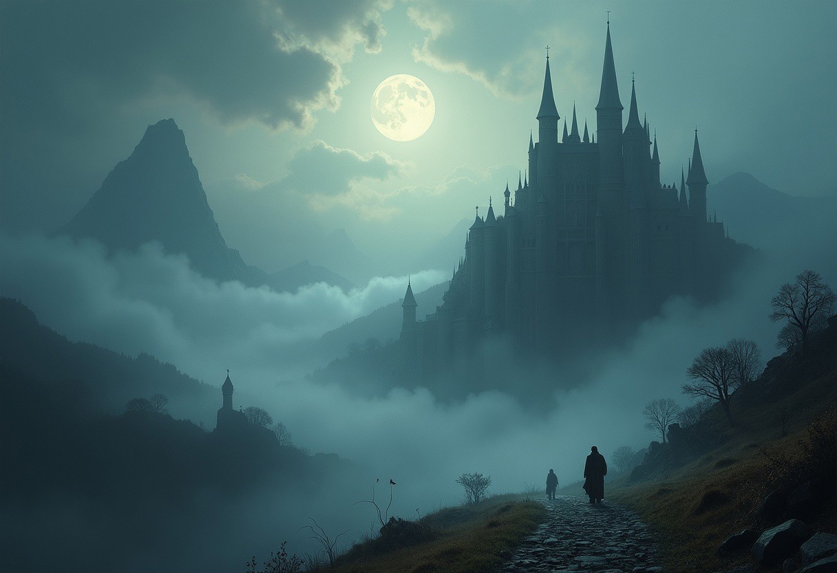 Thomas Kinkade style landscape with a level of depth in cloudy mist, eerie and ominous atmosphere, creepy elements, alchemy and magic themes, bright glow and shining edges, masterpiece digital painting, crisp and clean, very high details, 4K HDR, cinematic and breathtaking.