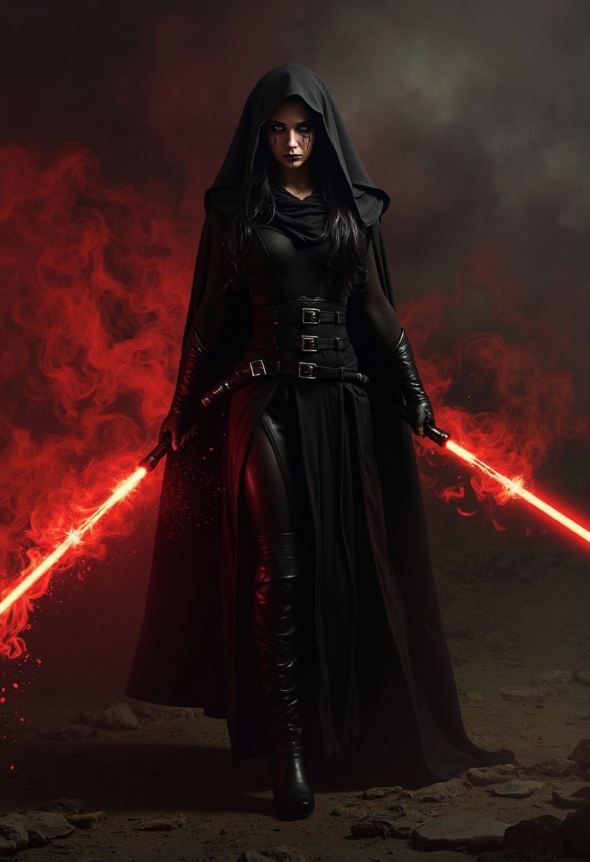 An atmospheric and powerful dark fantasy, natural organic and impressionist classical-style painting of a woman with long dark hair and a hood. The hood is black and covers her head and shoulders. The woman is wearing a black outfit. in the background there is a black and red smoke in the hands of the sith holding a red sword, she has dark black make-up running down her eyes, her hair is red lava in the background earthy area realistic, perfection style, sithoutfit