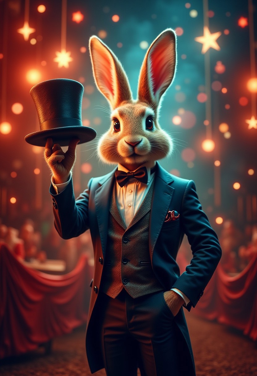 dreamstar, a rabbit magician in a suit and a top hat holding an upside down top hat with rabbit's ears sticking out of it, in a circus arena