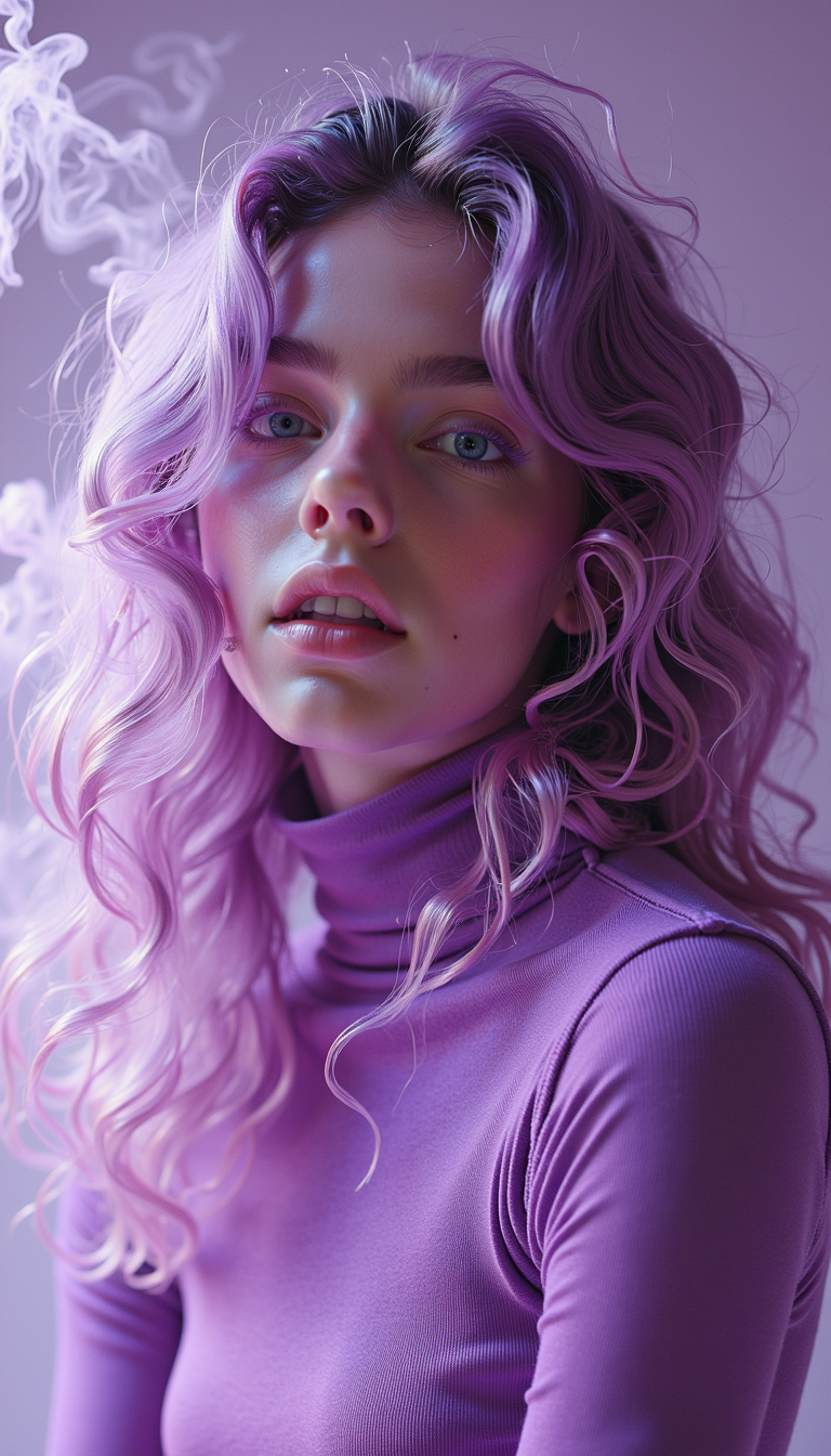 A surreal portrait of a young woman with long, wavy lavender hair in a dreamy purple atmosphere. She wears a form-fitting purple turtleneck and has piercing blue eyes that contrast with the monochromatic color scheme. Her expression is soft yet intense, with slightly parted lips. Wisps of smoke or mist swirl around her, creating an ethereal, otherworldly ambiance. The lighting is diffused and entirely purple, giving the image a cohesive and mystical quality. The subject's pale skin seems to glow against the purple backdrop, adding to the enchanting and almost supernatural feel of the portrait.