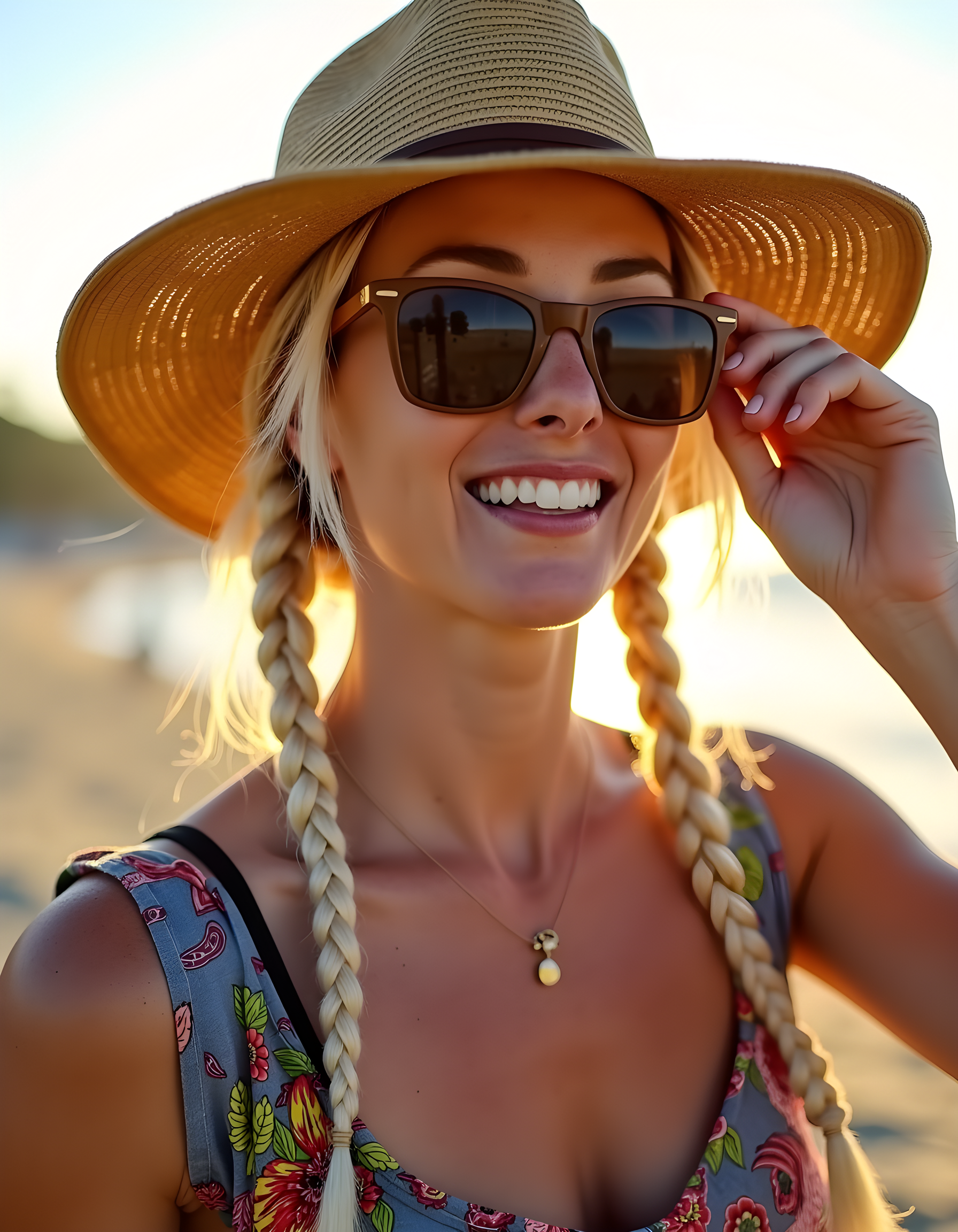 In a vibrant, sun-drenched Santa Monica beach scene, the captivating M3G4UG, with her radiant blonde hair cascading in twin braids down to her waist, wears a strikingly unique, bohemian-inspired shirt adorned with intricate, colorful patterns. She confidently poses with one hand shading her eyes from the sun with oversized sunglasses, while the other hand gently tucks a strand of hair behind her ear. Her eyes are closed in a serene, contemplative smile that seems to reach out and connect with the viewer. The soft, warm light of the setting sun kisses her porcelain skin, casting long shadows and highlighting the delicate features of her face. A wide-brimmed straw hat rests on her lap, its edges gently crumpled from the sea breeze, as she gazes out at the endless horizon, lost in thought. The image is captured in a close-up shot, focusing on her expressive eyes and perfect teeth, creating an intimate and captivating portrait that speaks volumes about her free spirit and zest for life.