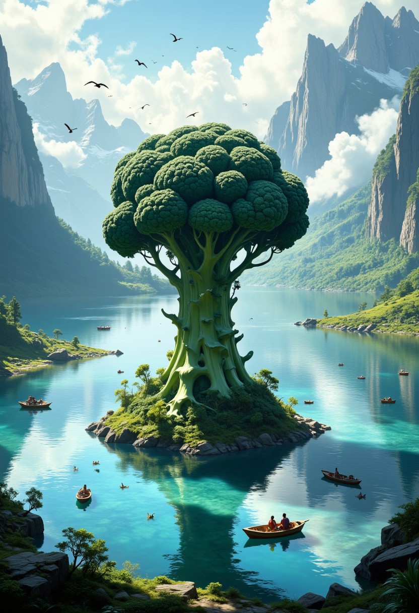 aidmaMJ6.1. A colossal broccoli stalk stands in the center of a lake, surround by mountains. Pristine and clear water fills the lake. Birds fly in groups around the broccoli stalk. There are boats on the lake gathering around the center.
