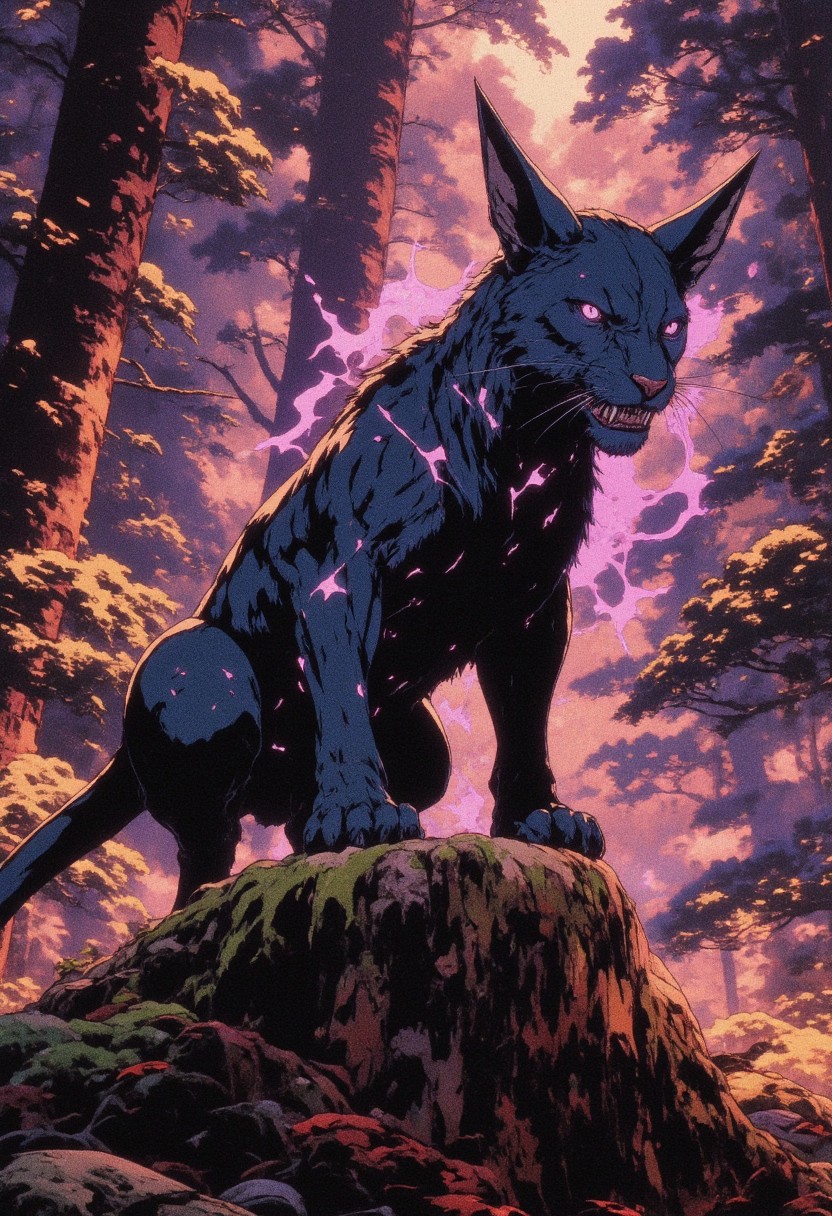 drkfnts style, ne0nfant4sy, wrcrftcnmtc, <lora:sxz-Warcraft-Cinematic-Flux:1> Create a digital painting in the style of dark fantasy art. Depict a fantasy creature that looks like a panthera with scales instead of fur standing in a forest landscape. It has purple glowing eyes. It is magical, it's claws and fangs glow with magic. It's scales are black and grey. It has long agile tail and short black horns. It is ready to attack its prey. Magic translucent shining in the background. Magic spells. The background showcases a dark tundra forest, the ground is covered with fallen leaves. The scene is rich with detailed textures, including moss-covered rocks, trees, and a muted, earthy color palette. dark fantasy<lora:sxz-Dark-Fantasy-v2-Flux:1>,<lora:NeonFantasyFLUX:1>,