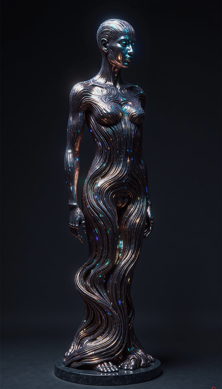 Bioluminescent,evangsurreal,surrealism,glitter, A medium shot, hyperrealistic render of an abstract sculpture formed from undulating, monochromatic strata against a stark, atramentous backdrop. The sculpture, evoking an anthropomorphic silhouette, should be rendered with meticulous detail, emphasizing the interplay of light and shadow across the sinuous forms. The lighting should be reminiscent of chiaroscuro, accentuating the sculptural depth and volume. Focus on the tactile quality of the material, simulating the subtle variations in reflectivity and texture inherent in polished stone or metal.
