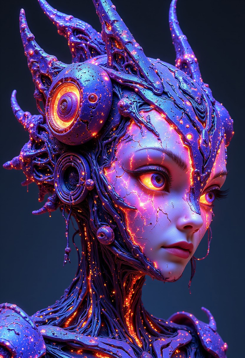 cybermono_style vibrant anime image of a cybergore mecha fish with glowing eyes and insides, glowing galaxy cracks skin. Fishy has teeth