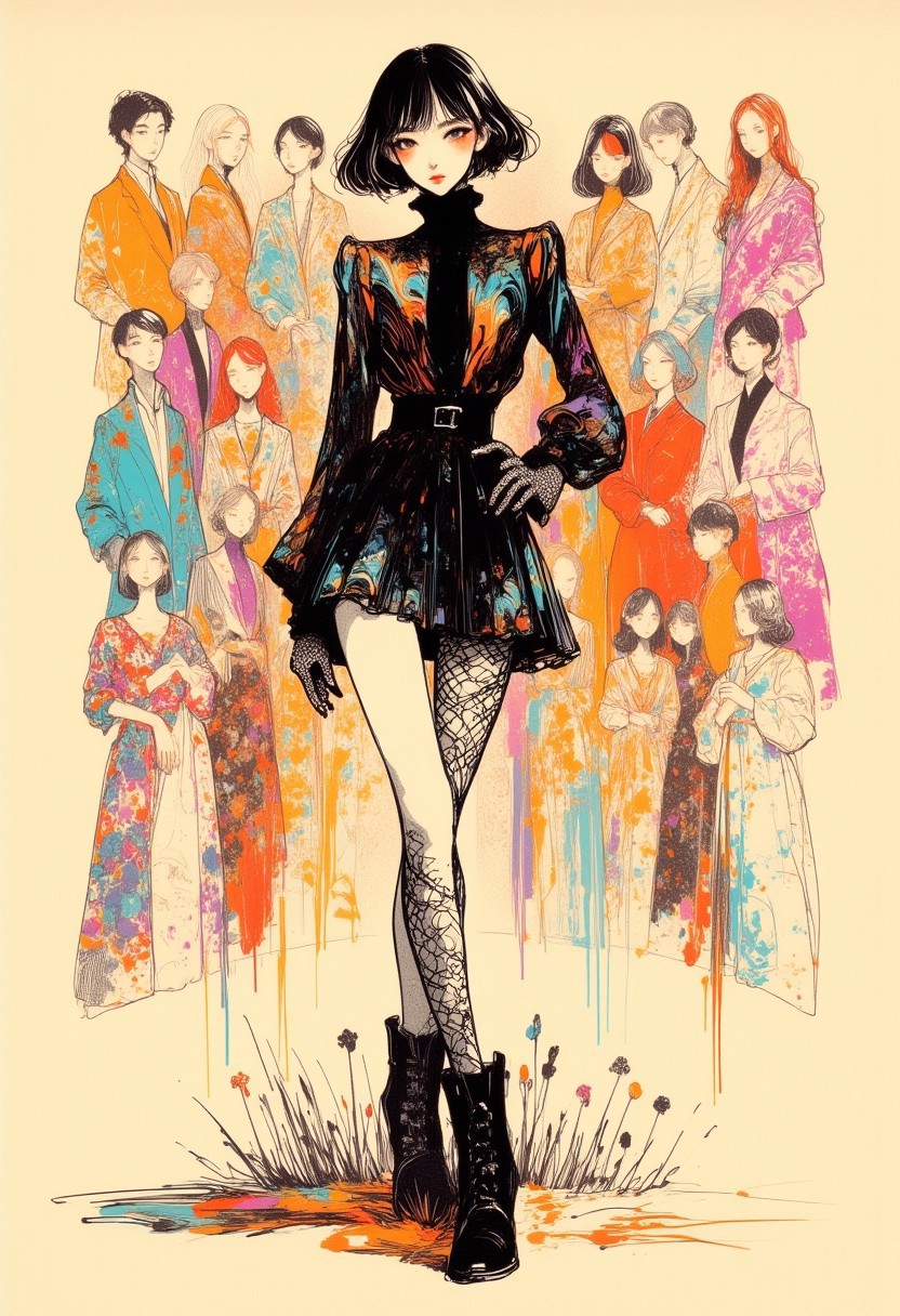inksketch, A slender, long-legged Japanese woman adopts an unusual, eccentric pose reminiscent of the iconic poses of characters from Hirohiko Araki famous manga JoJo's Bizarre Adventure. Her pose demonstrates the model's boldness and confidence, exaggerated angles and dynamic artistic taste. The image conveys the model's elegance and uniqueness by combining fashion and anime aesthetics, making it both vibrant and avant-garde.The beige background is filled with a holographic grid of patterned figures, drawn in warm colors, with an autumnal atmosphere