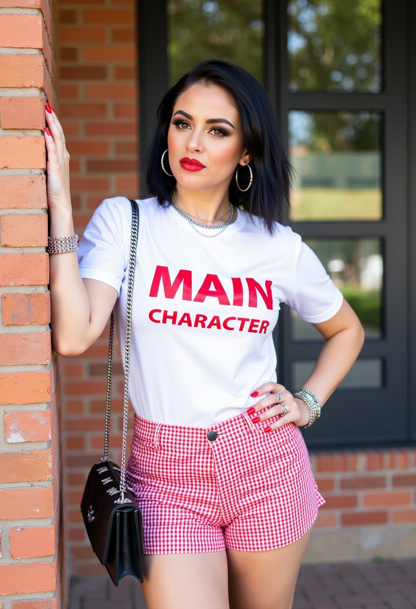 A portrait of a woman standing outdoors, leaning against a brick wall. She is wearing a white t-shirt with the text 'MAIN CHARACTER' in bold red letters, paired with red and white checkered shorts. She accessorizes with a silver chain necklace, a black handbag with studs, and multiple bracelets. Her makeup is bold, with dark eyeliner and mascara, and she has a confident pose with one hand on her hip and the other holding the bag. The background shows a window with a view of the outdoors, and the overall color palette of dominated by red, and black.