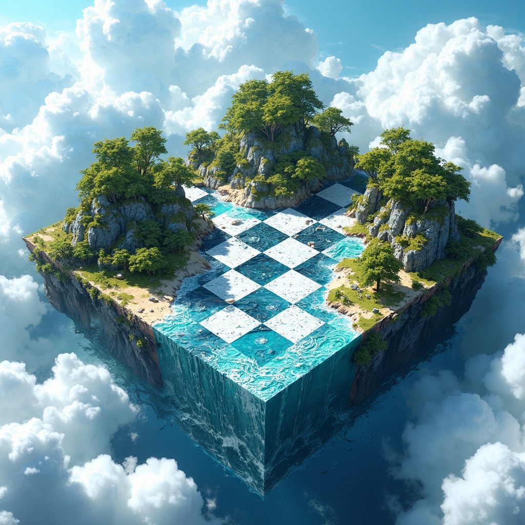 Detailed chess board chess board with water as white square and land as black squares, floating in air above clouds, realistic trees on land and waves in water