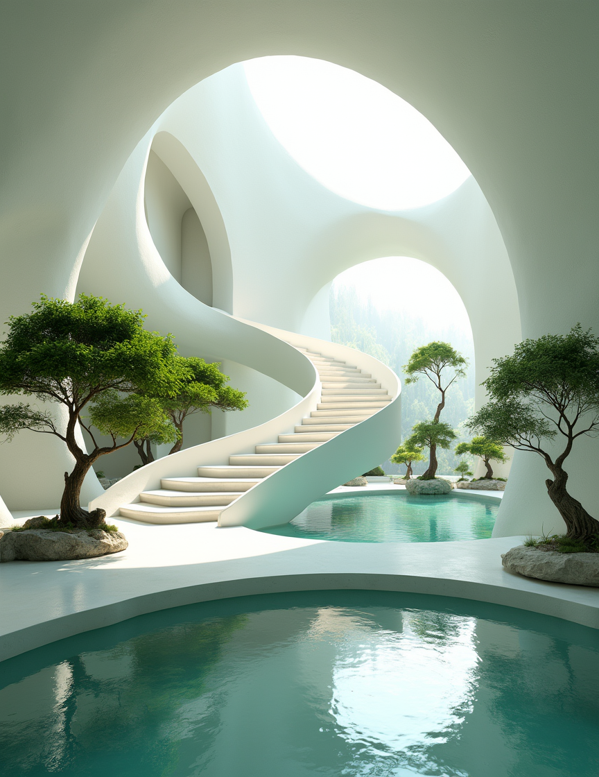 a breathtaking, futuristic architectural design that merges nature and elegance. The setting features a serene indoor environment with large, smooth, organic-shaped arches framing the space. Lush green trees, particularly bonsai-style trees, are scattered throughout, creating a sense of harmony and tranquility. A winding, sculptural white staircase is centrally located, curving gracefully toward an upper level, which appears to be bathed in natural light from the large openings.The floor is polished and reflective, with sections of shallow water incorporated into the design, giving the illusion of a floating landscape. The reflection of the trees and architectural elements in the water further enhances the peaceful, almost dream-like atmosphere. The walls and ceilings have a soft, sculpted appearance, complementing the natural greenery and enhancing the minimalist yet luxurious aesthetic. The overall feel is that of a tranquil, modern sanctuary blending organic forms with contemporary design principles.