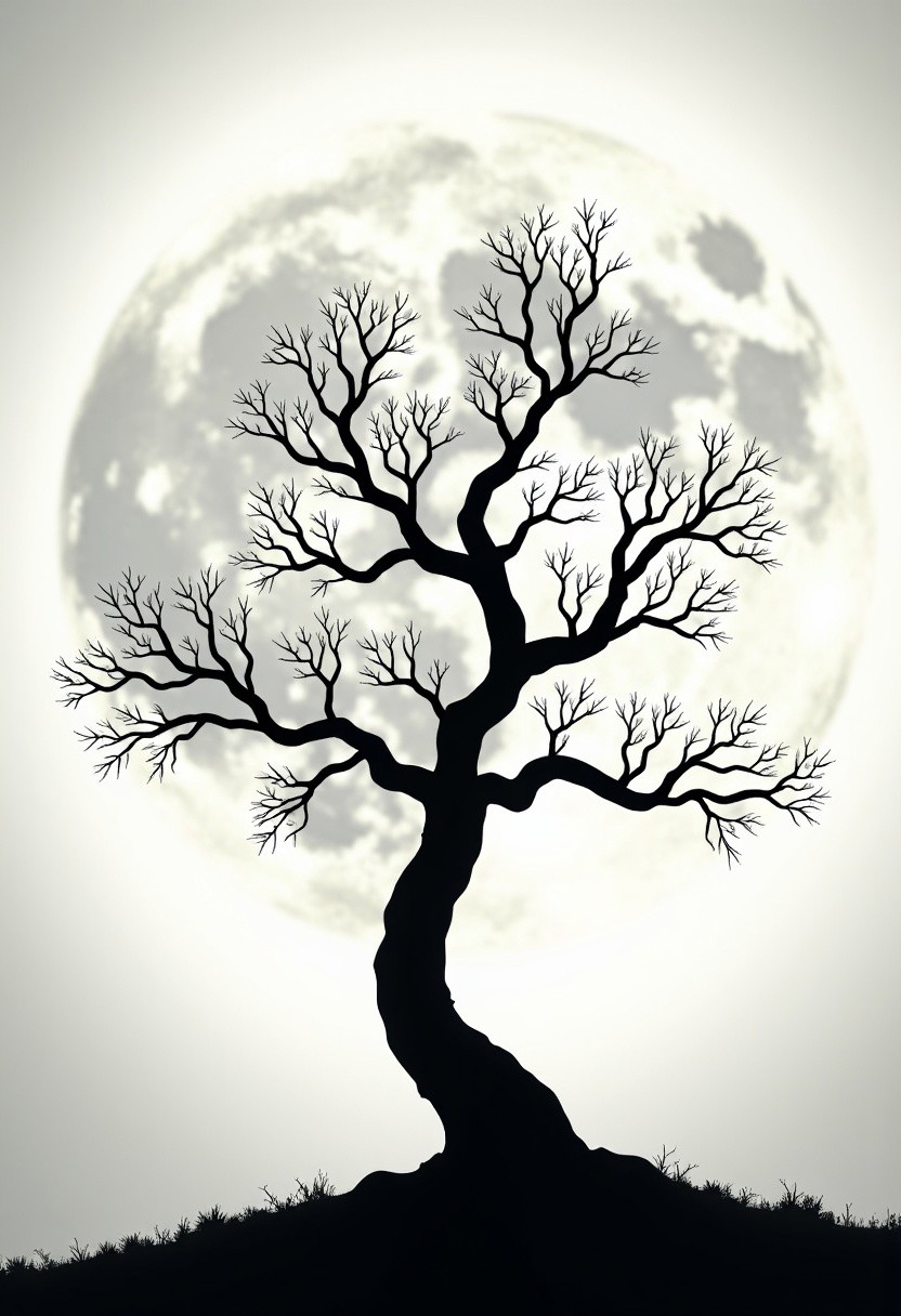 A high-contrast image of a single, gnarled tree standing against a glowing, moonlit sky. The tree's intricate branches form a stark black silhouette, while the background is a pure, radiant white with faint hints of grey shadows. The image is minimalistic, emphasizing the sharp edges and contours of the tree, creating a dramatic and hauntingly beautiful scene. The simplicity of the composition enhances the stark contrast between light and dark, drawing attention to the delicate, twisted details of the branches.