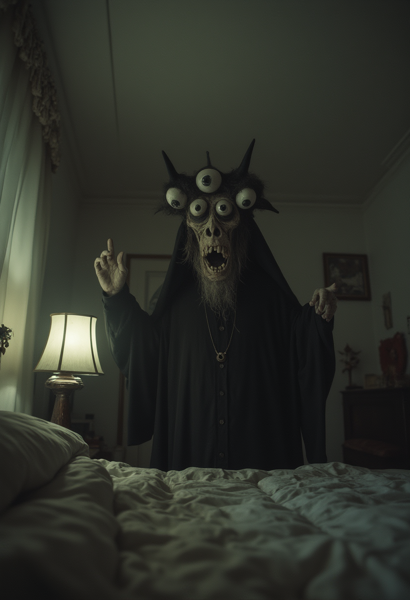multi-eyed-catching a terrifying soaked in darkness fat and hairy multi-eyed cursed nun with long horns cultist with ghostly eyes monster under the bed, lurking you, scared and cornered in a cozy living room with an old-fashioned renovation, a dark nightmare feeling, large amount of small details and details, analog photo, cinematic, dark mood and dark ambient, found footage, photo from a real cult, 1920s photo, old VHS footage, old CCTV footage, collodion print, intense chiaroscuro contrast dark ambient horror style, , (unsettling photo:1.2), cursed_thing, cursedimages, no context, cursed image, bad photo, weird photo, very strange, color photo, creepy photo, (nightmare fuel)