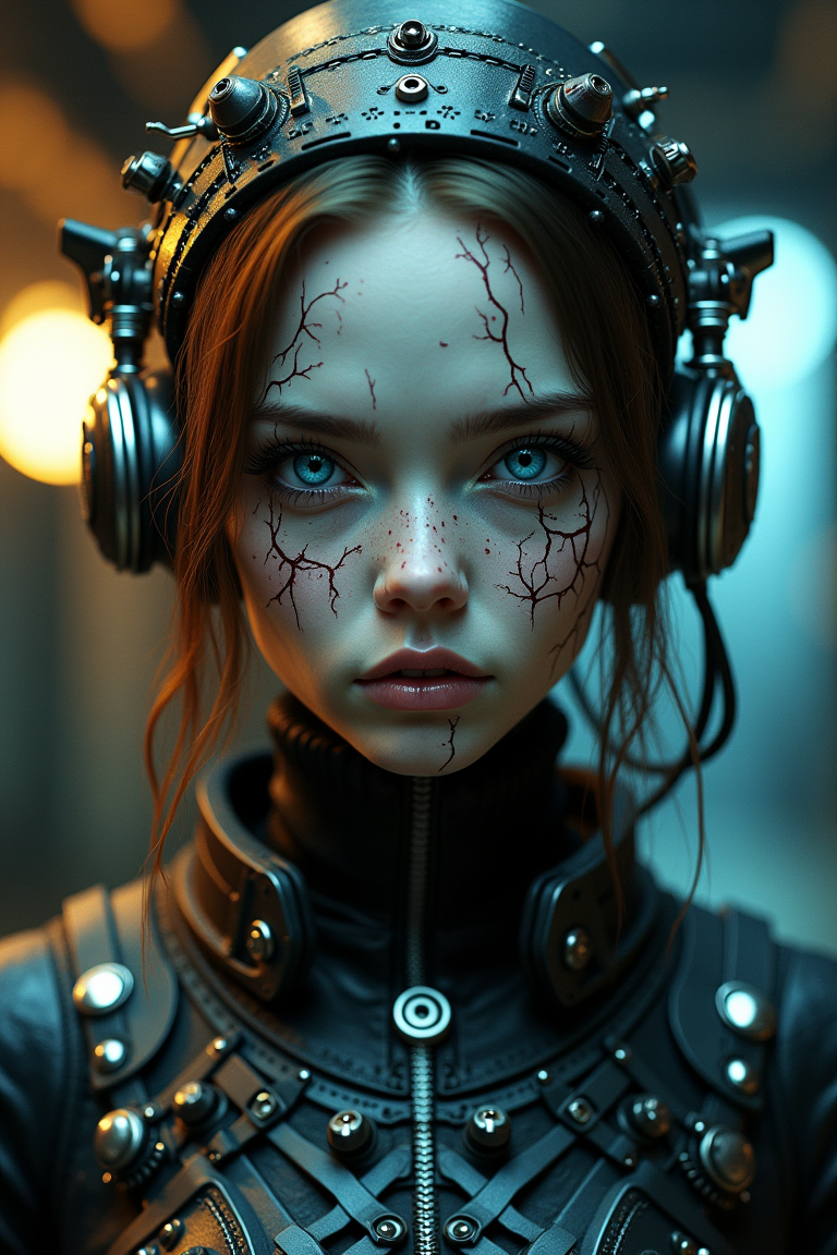 A close-up, highly detailed digital artwork depicts a cybernetic figure with an intense and haunting expression. The character has pale porcelain-like skin adorned with intricate black mechanical lines resembling cracks or circuitry patterns across the face, creating a striking contrast against their fair complexion. Bloodstains are visible on the forehead and cheeks, adding to the eerie appearance. Large, expressive blue eyes gaze directly at the viewer, conveying a mix of intensity and focus. The figure's brown hair frames the face, partially disheveled and blending with the complex headgear. This elaborate metallic headdress consists of numerous components including cables, connectors, gears, and small devices attached symmetrically around the head, enhancing the futuristic aesthetic. The dark leather armor features metal straps, circular elements, buttons, and buckles forming a lattice structure across the chest area. The lighting is dramatic and low-key, coming from the front-left side, highlighting the facial features while casting deep shadows, emphasizing the textures and details. The background is blurred with soft bokeh effects from out-of-focus lights in amber yellow and cool blue tones, suggesting an industrial setting with dimly lit structures. The overall mood is dark, mysterious, and technologically advanced, creating a high-contrast, low-luminance scene that focuses intensely on the central figure's cybernetic enhancements.
