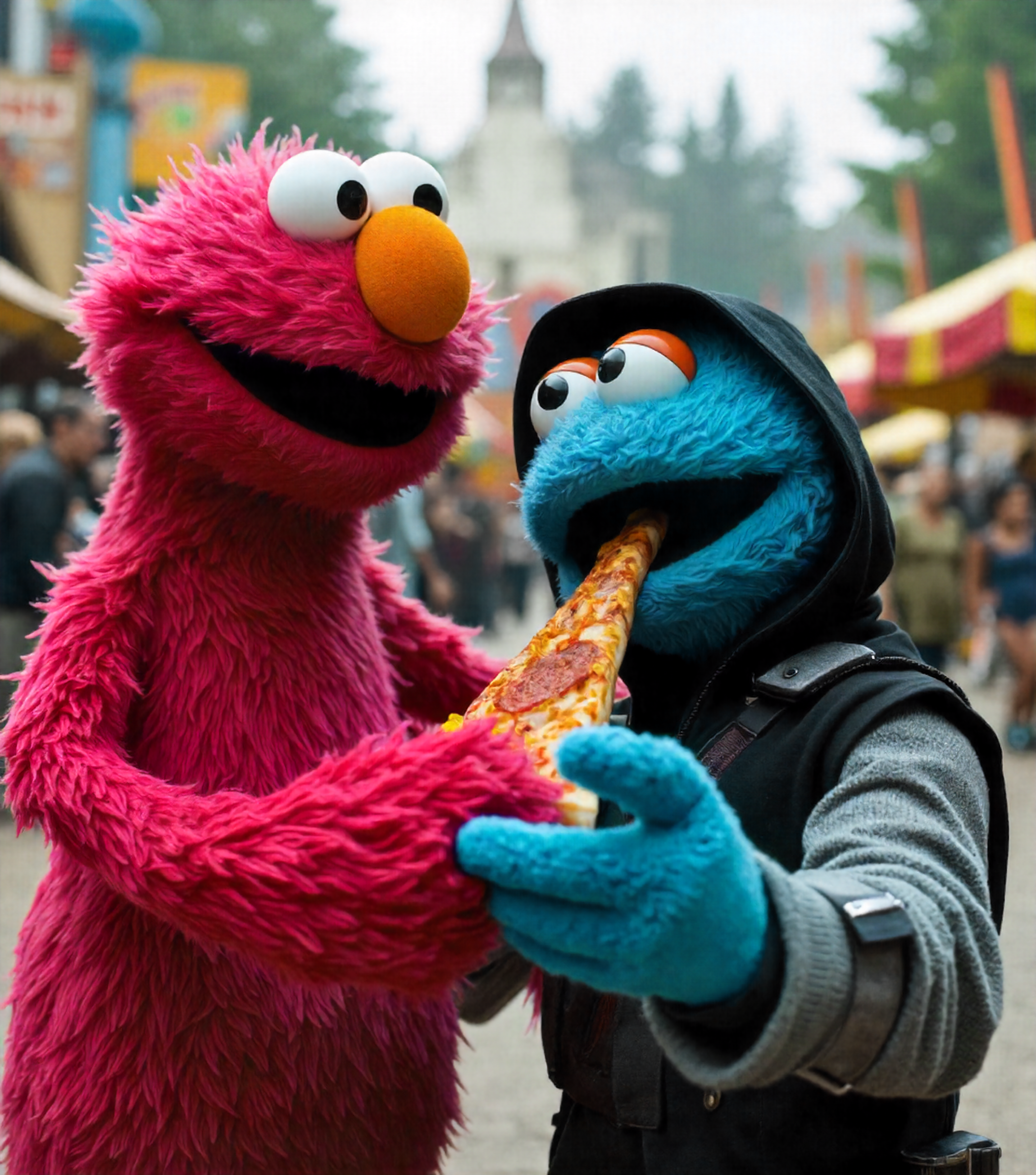 a high-definition architectural photograph with sharp lines, realistic textures, and lifelike rendering of space and structure,of two characters in a scene together, the characters are cliche and recognizable ,BREAK, , Elmo from Sesame Street, red fur, large eyes, childlike, high-pitched voice, and Sub-Zero from Mortal Kombat, ninja, blue outfit, ice powers, masked, , one is sharing a pizza with the other, ,at a lively carnival with colorful tents and excited crowds