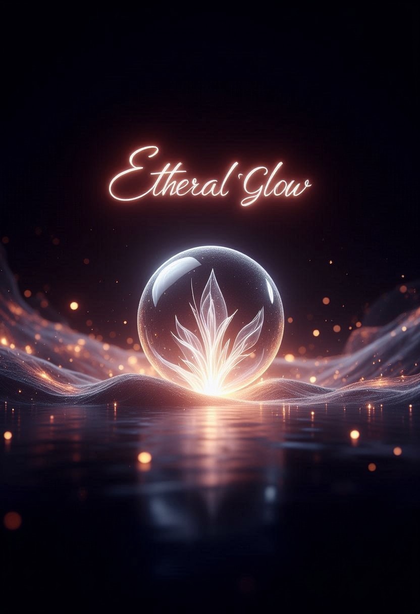 EtherealGlow, a deep black background that softly fades into swirling shades of dark purples and blues, with faint glowing wisps and fading stars adding texture and depth. A radiant white line wave passes through a floating translucent crystal orb, its surface reflecting intricate light patterns. Surrounding the orb, small floating orbs of light shimmer gently, enhancing the ethereal atmosphere. The big text "Ethereal Glow" hovers above the orb, written in glowing script, fading softly at the edges, as if merging with the background. The faint geometric shapes and glowing fractals ripple subtly in the distance, creating a sense of depth and mystery. The scene feels dreamlike and mystical, illuminated by the soft glow of the orb and text.