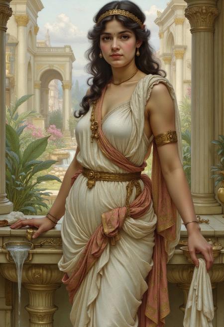 hyp3rd3tail style 19th century Victorian oil painting by Ernest Normand, (closeup upper body portrait) of a beautiful young woman posing in Ancient Greece, wearing traditional looking Ancient Greek dress, standing in an outdoor garden with tiny waterfall