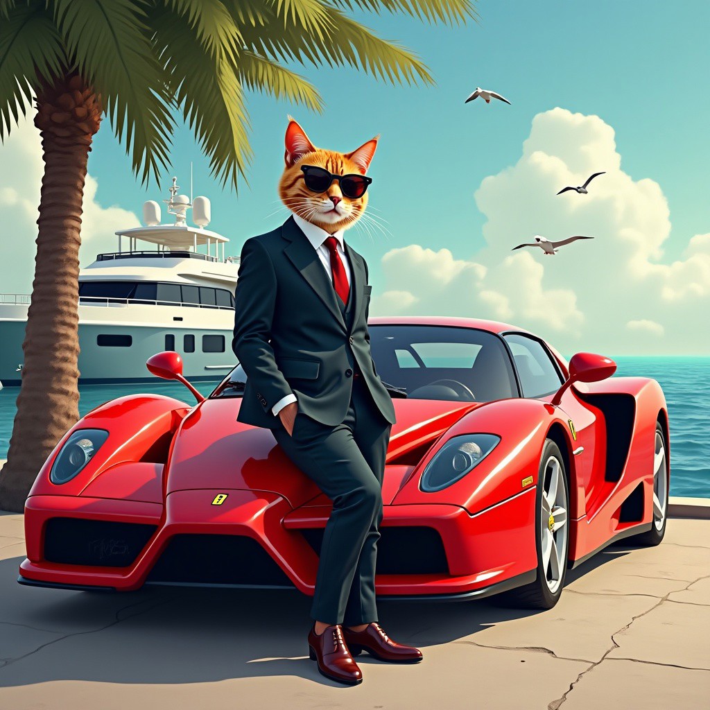A British cat in a fashionable classic suit and round sunglasses, dark brown patent leather shoes is leaning against a Ferrari enzo car. The proportions of a cat's body, not a human's. the car is parked at the curb, palm trees grow next to the car, the sea and a luxury yacht are visible in the background. There are two or three seagulls flying in the sky