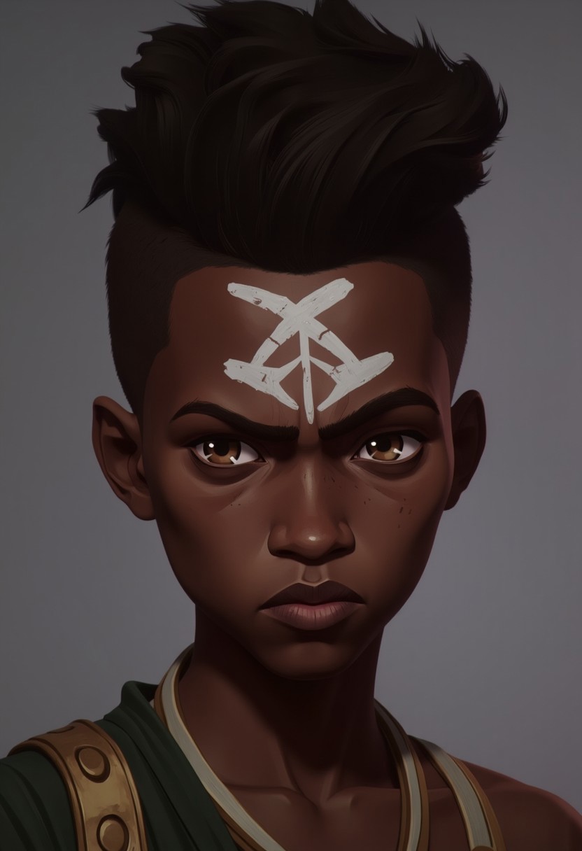 The image is a digital painting with a realistic, semi-realistic style, showcasing a young, dark-skinned person with a striking, intense expression. The subject has a high forehead and a distinctive hairstyle with a large, white, almost tribal-like pattern on the forehead, suggesting a possible cultural or ceremonial significance. Their eyes are piercing, with a deep, contemplative look, and their skin is a rich, dark brown.