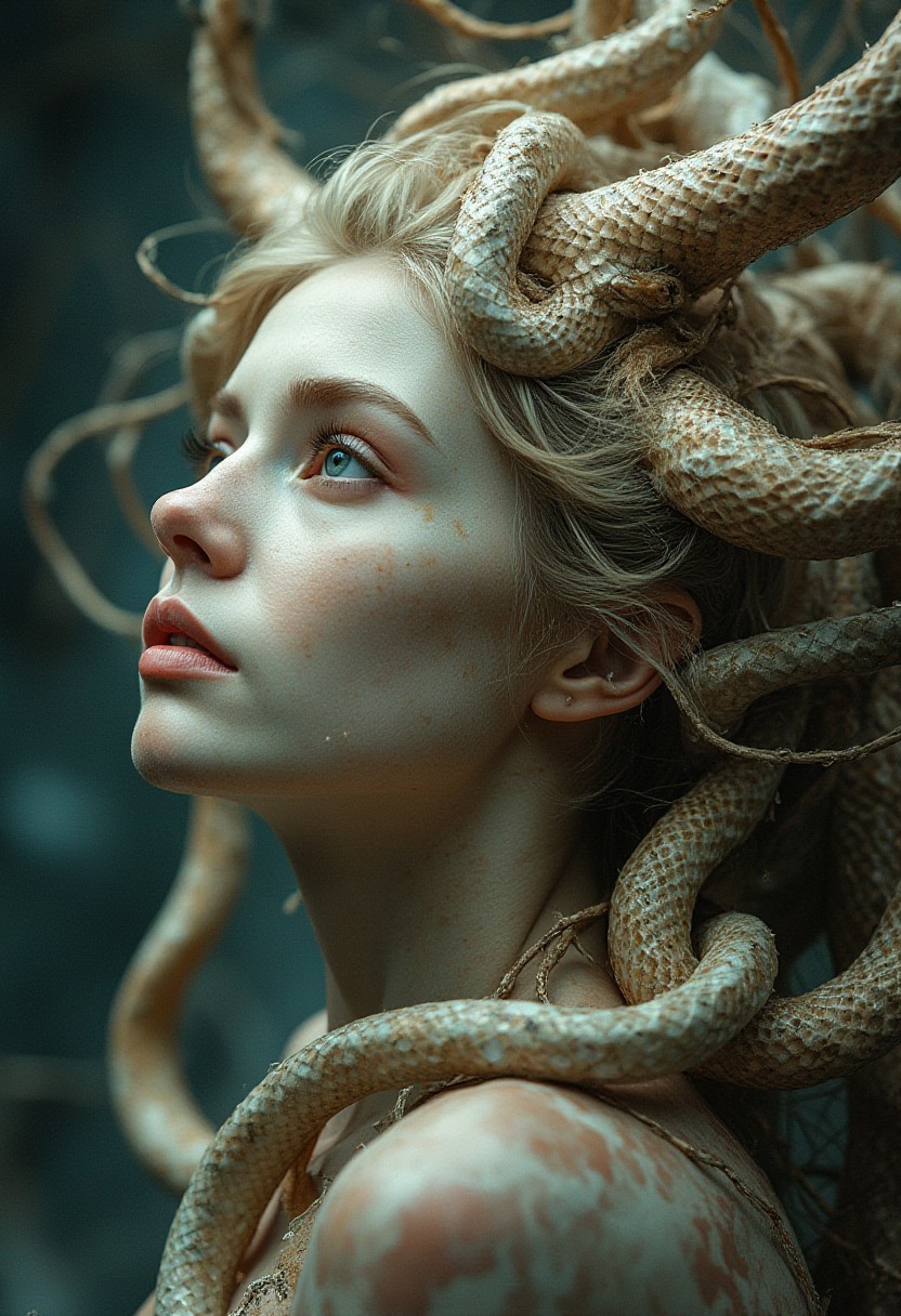 A Medusa Gorgon profile face with a pale, porcelain-like complexion, subtly infused with gentle, rosy highlights, gazing upward with a subtle, sultry expression, her full lips slightly parted, surrounded by a mesmerizing array of angry snakes that intricately weave around her.