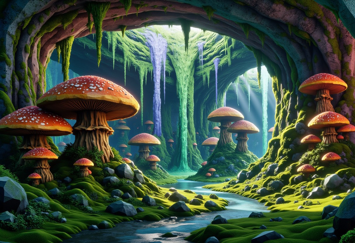 A vivid and fantastic underground realm, a giant system of expensive underground caves connecting to each other via large passage ways. The caves are populated with mushrooms the size of trees. Enormous crystals litter the walls and ceiling emitting a splendid and wonderful variety of colors providing light to a world devoid of sunlight. Stalactites and stalagmites are scattered across the expansive open caves. Moss covers the stony ground offering a gentle surface to tread upon. Small streams feed large ponds and small lakes creating natural reservoirs of water. It is a scene straight out of fantasy, wondrous, magnificent, awe-inspiring, epic the kind of scene people only dream about, made real.