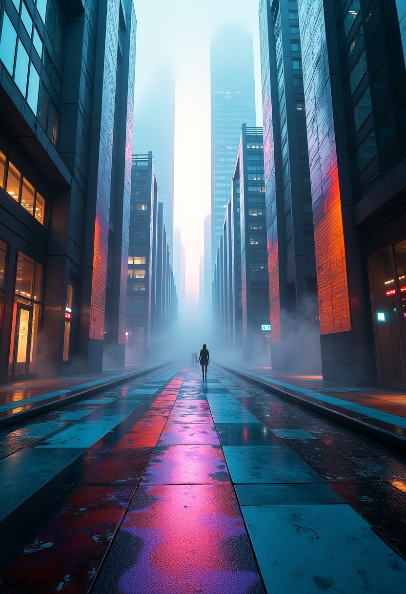 The photograph captures a stunning interplay of light and shadow, blending elements of cyberpunk architecture with abstract expressions of color theory, as envisioned by Daniel Libeskind and Mark Rothko. The image is set at a unique shooting angle that provides an unusual yet visually impactful perspective.**Angle and Composition:**The camera is positioned low to the ground, slightly tilted upwards, creating a dynamic diagonal composition that stretches from the bottom left corner of the frame towards the upper right corner. This angle emphasizes the towering, angular forms of Daniel Libeskind's futuristic skyscrapers, which are partially obscured by the smog-like fog characteristic of cyberpunk settings.**Cyberpunk Architecture:**The buildings in the foreground feature sleek, metallic surfaces with intricate geometric patterns that reflect and distort light. These structures are part of a sprawling metropolis with neon lights flickering in vibrant hues of blue, red, and green. The architecture is characterized by jagged edges and sharp angles, yet maintains an ethereal quality due to the soft, diffused lighting.**Mark Rothko-Inspired Colors:**The buildings' surfaces gradually transition into a series of abstract color fields, reminiscent of Mark Rothko’s work. Large swaths of deep, saturated blues, purples, and oranges intermingle with the metallic sheen, creating a mesmerizing optical effect. The colors appear to bleed and merge at their edges, almost like a digital painting come to life.**Lighting:**The lighting is diffused and ambient, with soft, warm hues casting long shadows across the landscape. A single, bright, neon light emanates from one of the buildings in the background, illuminating the entire scene with a stark contrast between illumination and shadow. This central light source creates a dramatic interplay of light and dark, enhancing the overall visual impact.**Background Elements:**In the distance, there are subtle hints of other structures and figures moving through the environment, adding depth and movement to the composition. These elements are rendered in muted tones that gradually fade into the background, creating a sense of endless space.Overall, this photograph encapsulates the essence of cyberpunk aesthetics with its futuristic urban landscape, while also incorporating the abstract and emotive qualities of Mark Rothko’s color theory. The unique shooting angle and careful use of light and shadow create a captivating visual narrative that transcends both genres. HD32K, hyperdetailed, best quality, aidmaMJ6.1.