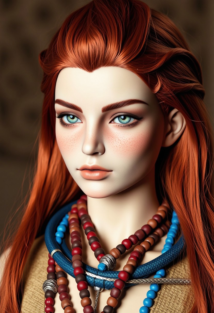 Exquisite dolls style, a beautiful girl, Aloy, a redhead woman with frekles and necklaces