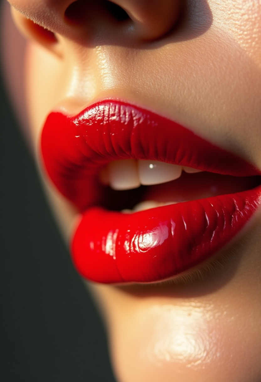 A closeup on lips, with a bright red lipstick, highly detailed lips, with a warm light, vogue photograph, peach fuzz, skin is not shiny, slight imperfections of the skin