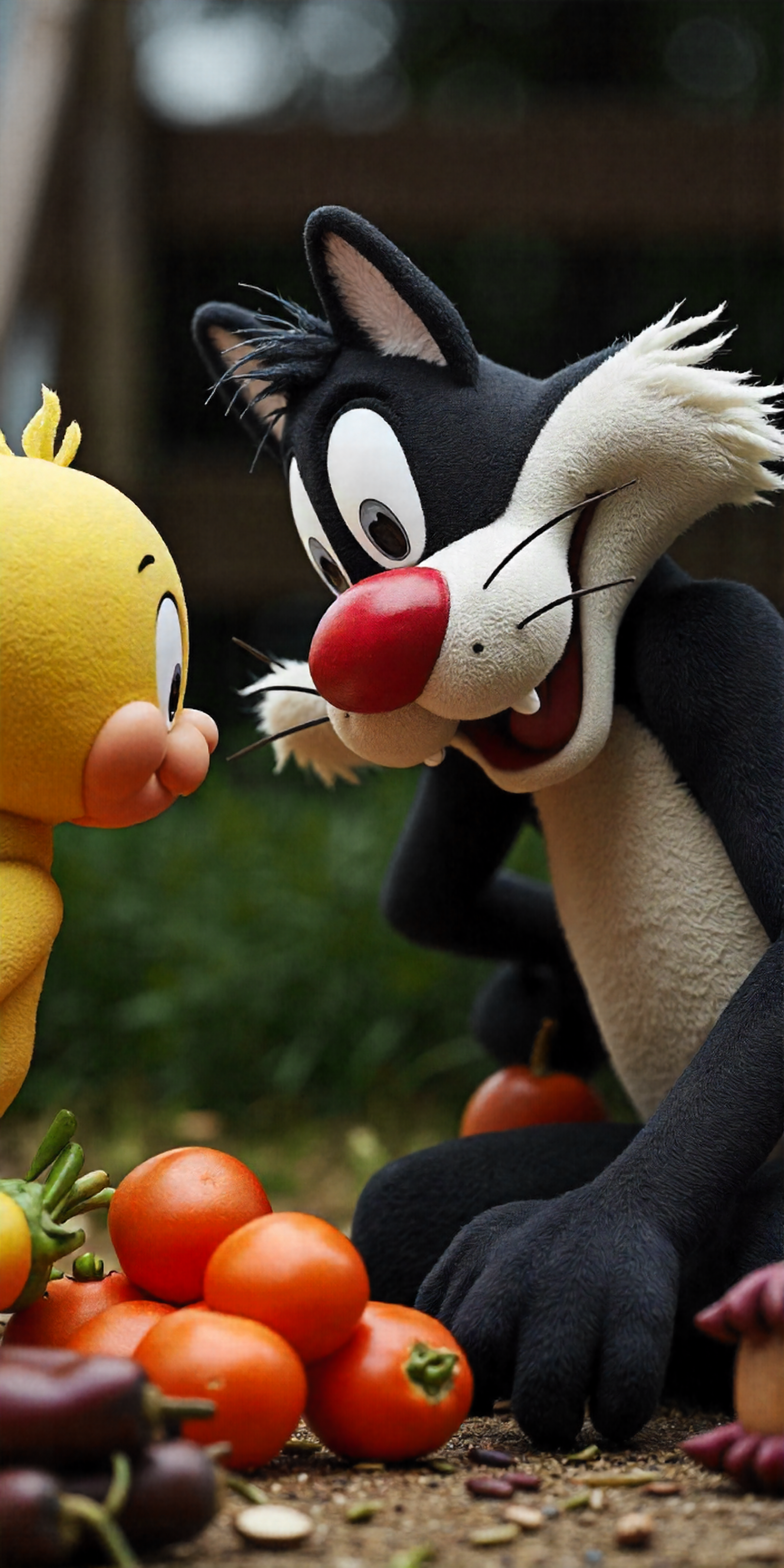 a dramatic studio portrait with realistic skin textures, high contrast lighting, and intricate facial details,of two characters in a scene together, the characters are cliche and recognizable ,BREAK, , Sylvester from Looney Tunes, black and white cat, clumsy, chases Tweety, and Goron from The Legend of Zelda, large rock-like creature, muscular, friendly, , one is racing toy cars with the other, ,at a vibrant farmers market with colorful produce and handmade goods