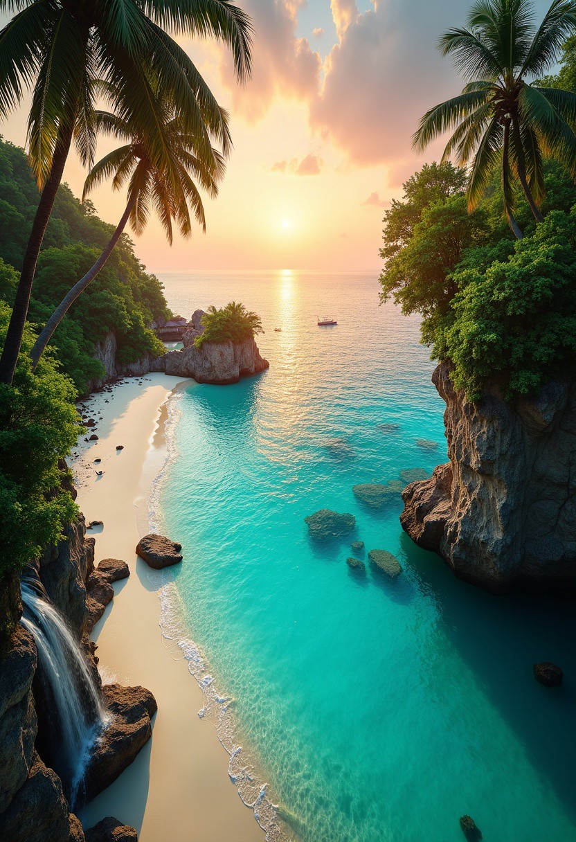 A breathtaking view of paradise, a secluded tropical island with crystal-clear turquoise waters gently lapping against the white sandy shores. Tall, lush palm trees sway in the warm, gentle breeze, casting soft shadows on the sand. In the distance, vibrant coral reefs shimmer beneath the water's surface, teeming with colorful fish. The sky is a brilliant gradient of orange and pink, as the sun sets in the background, casting a warm, golden glow over the scene. A gentle waterfall cascades from a rocky cliff, surrounded by dense, emerald green foliage. Light rays pierce through the canopy, creating a dreamy, ethereal atmosphere. The scene is captured with a wide-angle lens, giving a sense of vastness and serenity, with a slight lens flare adding to the cinematic effect.