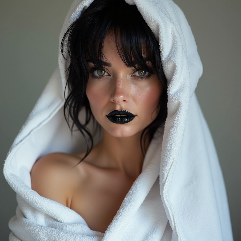 A close-up portrait of a [Model] wrapped in a pristine white towel, reminiscent of Mario Testino's iconic "Towel Series." The [Model] should exude confidence and allure, with a hint of vulnerability in their eyes. The towel should be draped artfully, revealing just enough skin to tantalize the viewer. The lighting should be soft and diffused, creating a sensual and intimate atmosphere. The background should be simple and uncluttered, allowing the focus to remain on the [Model]'s face and figure. (Goth Girl) (very dark hair) (black glossy lip) Style: Hyperrealistic, with a touch of fashion editorial flair. Emphasize the model's natural beauty, the texture of the towel, and the interplay of light and shadow. Additional details: * High resolution for maximum detail * Focus on the model's eyes and expression, capturing their unique personality and charisma * Experiment with different poses and angles to create a dynamic and engaging composition * Consider adding subtle details like water droplets on the skin or a hint of steam in the air for added realism