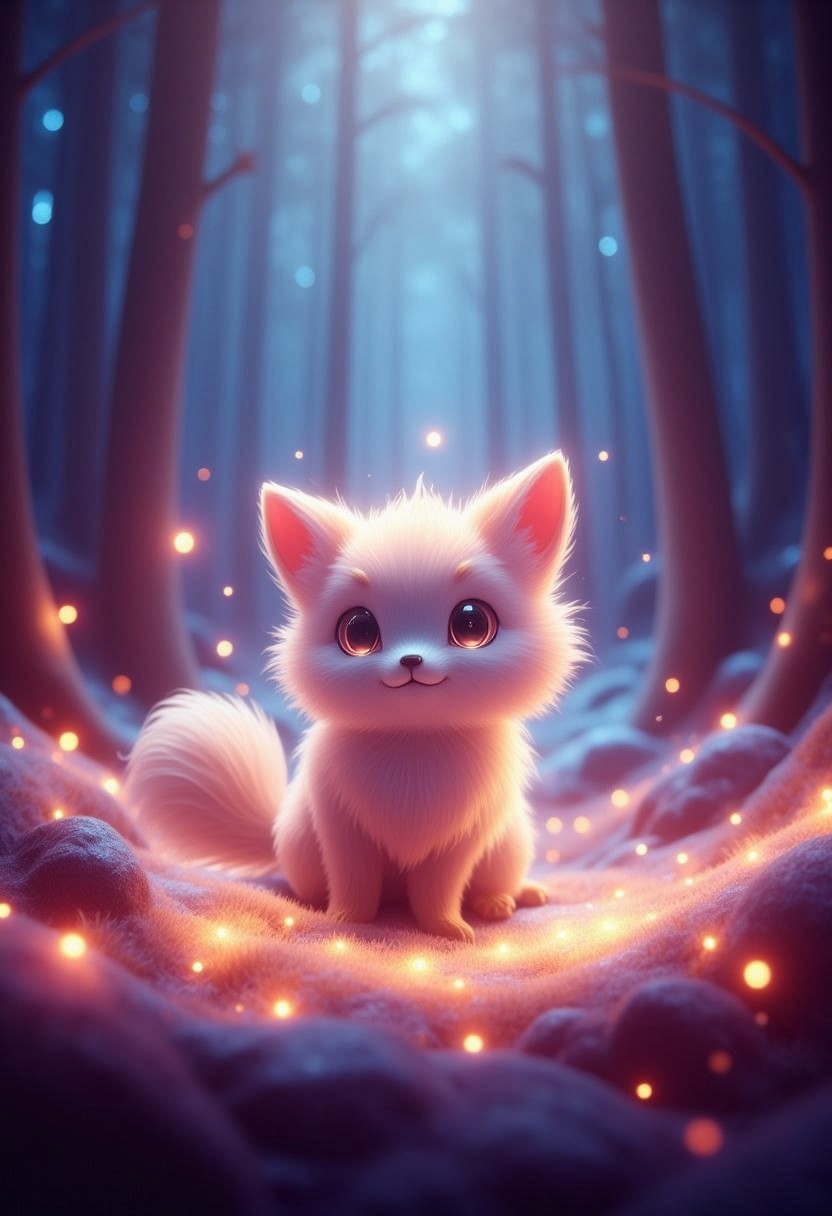 EtherealGlow, a small, adorable animal with soft, glowing fur, floating gently in a mystical forest. The animal's eyes shimmer with a calming, otherworldly light, surrounded by tiny floating sparkles. The scene feels dreamlike, with soft pastel colors and a magical, ethereal ambiance that glows softly around the edges, creating a peaceful, enchanting atmosphere.