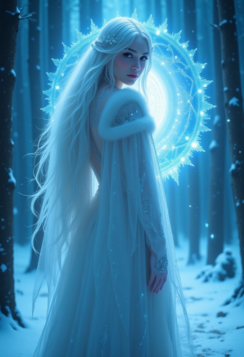 Cinematic style, A hyper-realistic fantasy scene featuring a stunning elven queen with long, flowing platinum blonde hair, standing in a mystical snow-covered forest. She wears an elegant, ornate white gown with intricate silver details and fur accents. Behind her, a radiant, magical mandala-like aura of glowing, icy patterns spreads out, adding an ethereal and divine presence. The background is softly lit with diffused, cool blue light filtering through the tall, dark trees, creating a serene and otherworldly atmosphere. The overall mood is majestic and enchanting, with a focus on the fine details of her attire, the glowing aura, and the interplay of light and shadow.