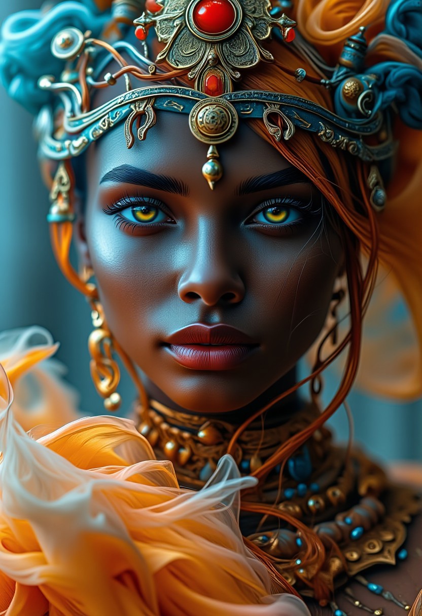 bv-smowormor, smoke, A cinematic close-up of a robotic-woman's face with intricate lights, wires and golden ornates, merging with colorful artistic smoke. Her delicate features subtly dissolve into surreal wisps, as if her very essence is evaporating into the air, obscuring and revealing her contours
