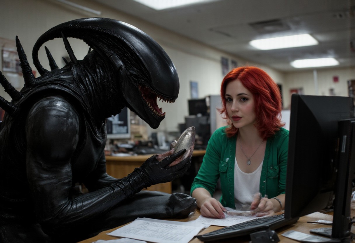 a realistic candid real life raw analog photo with perfect detail and lighting in sharp focus, dramatic lighting, realistic body proportions and anatomy, BREAK,Xenomorph from Aliens, black exoskeleton, elongated head, vicious is catching fish with Lois Griffin from Family Guy, red hair, green shirt, housewife, rational ,in a bustling office with typing keyboards and phone calls